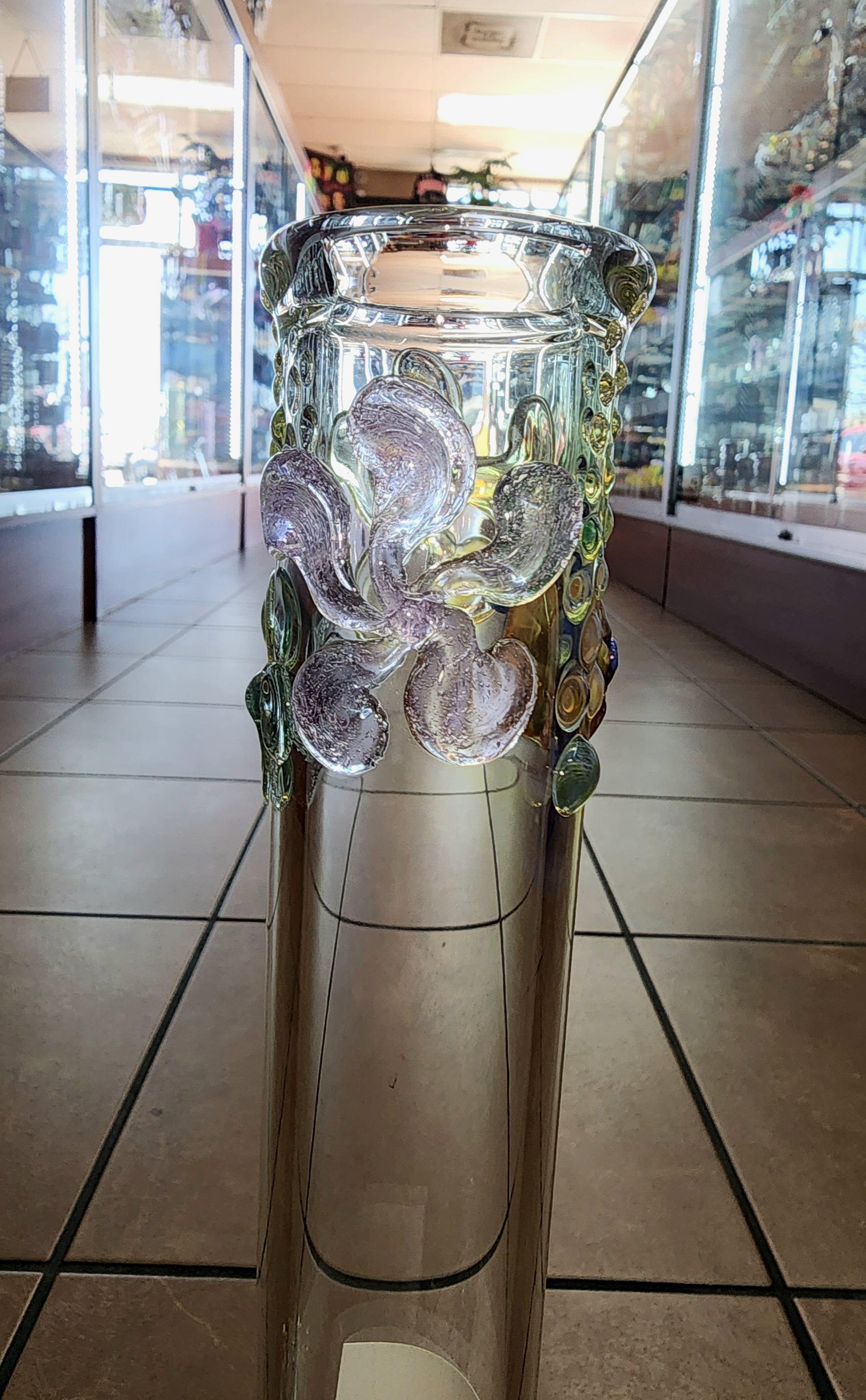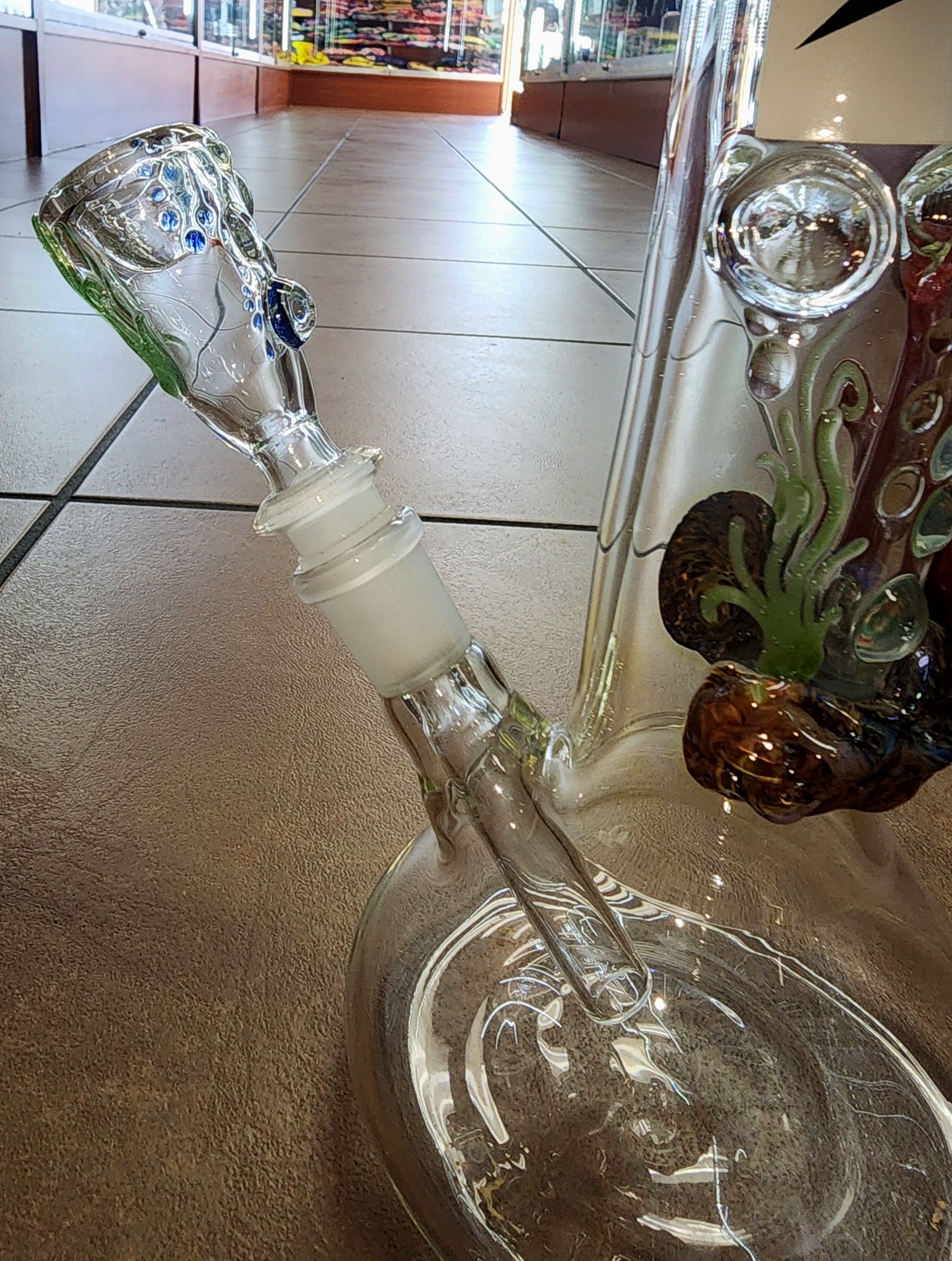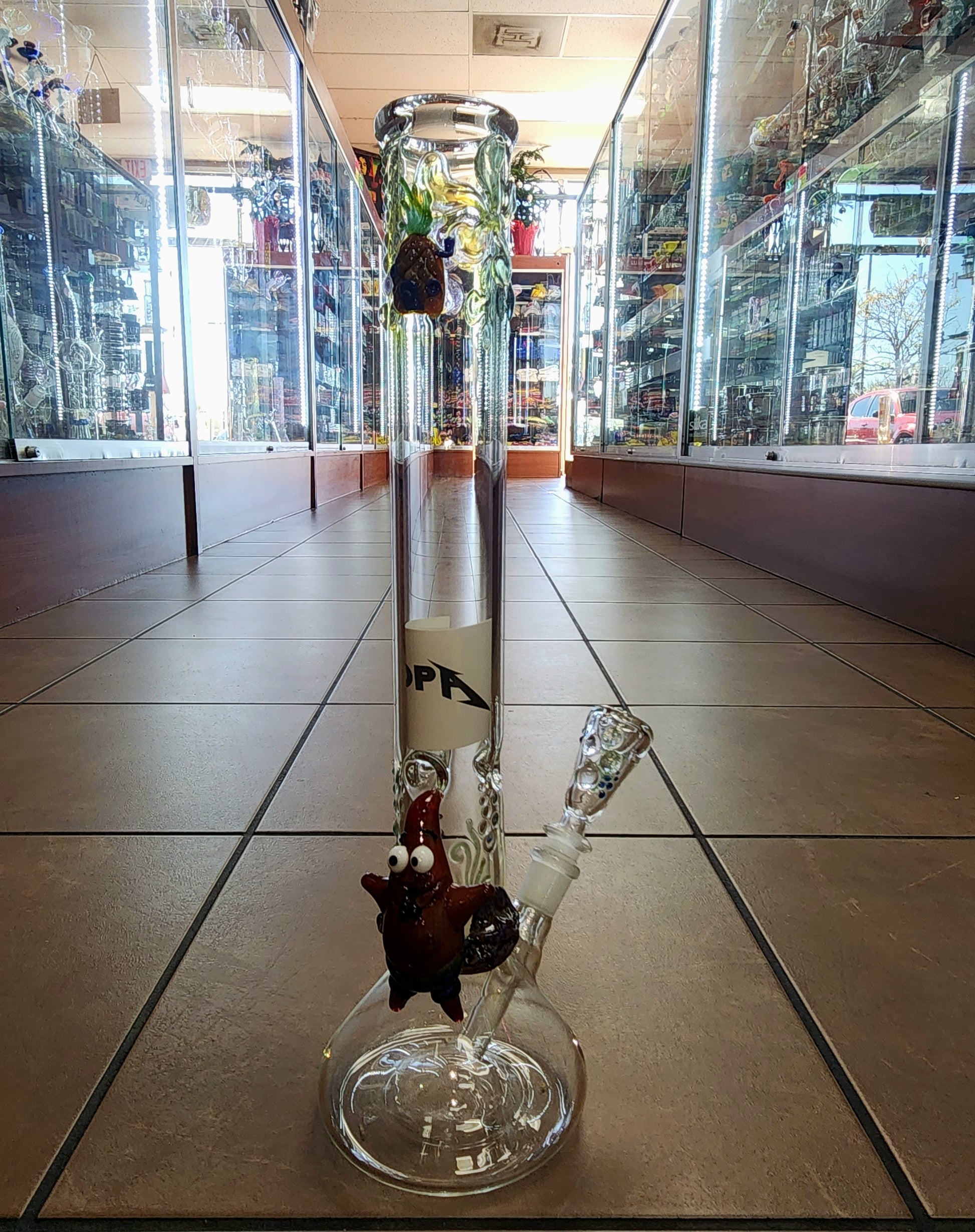 This custom Patrick Star piece from Dave Popowitz measures right over 16" tall. Features a custom Patrick Star, custom ocean theme 14mm bowl. Also has ocean theme around the top of beaker.