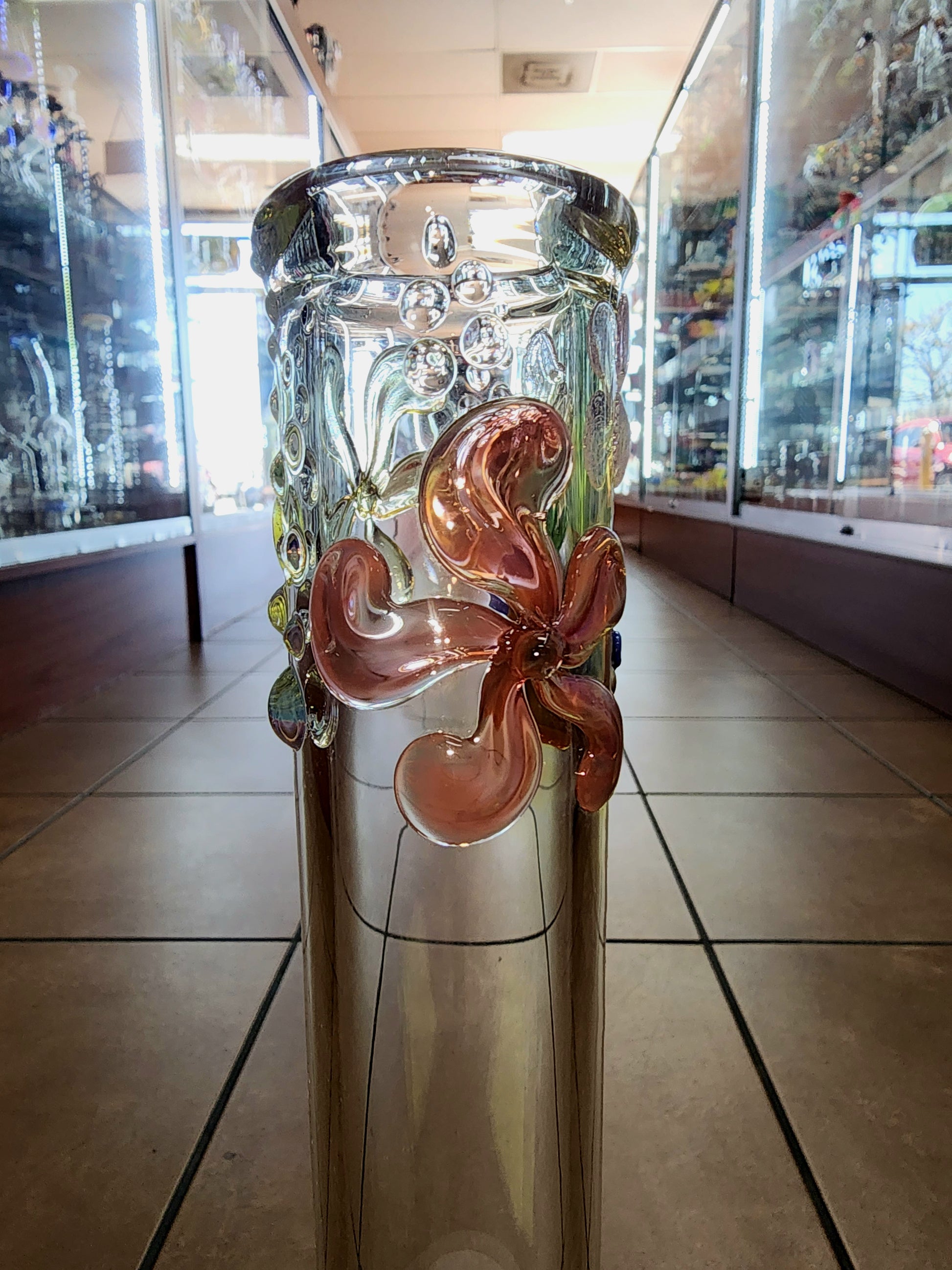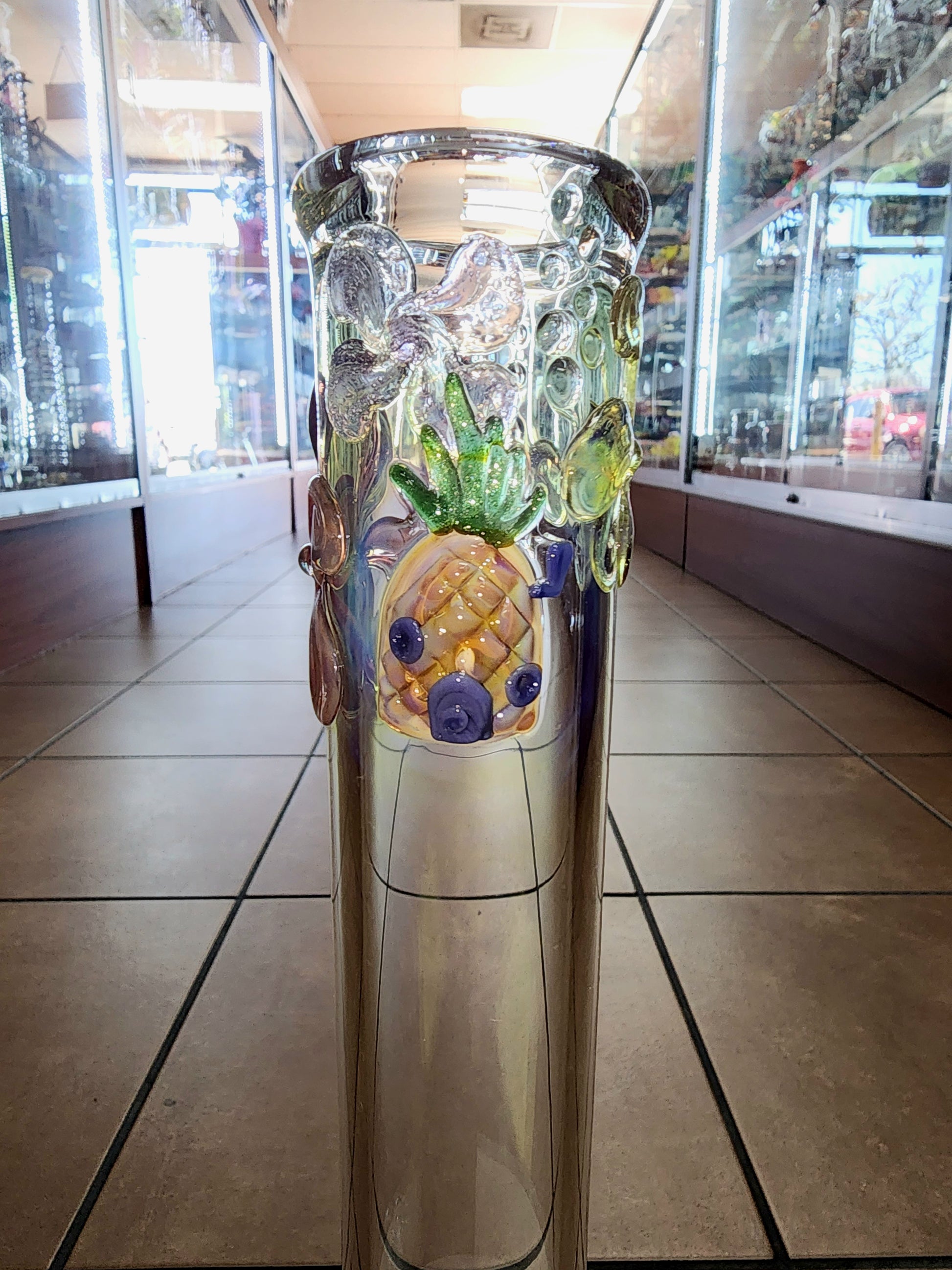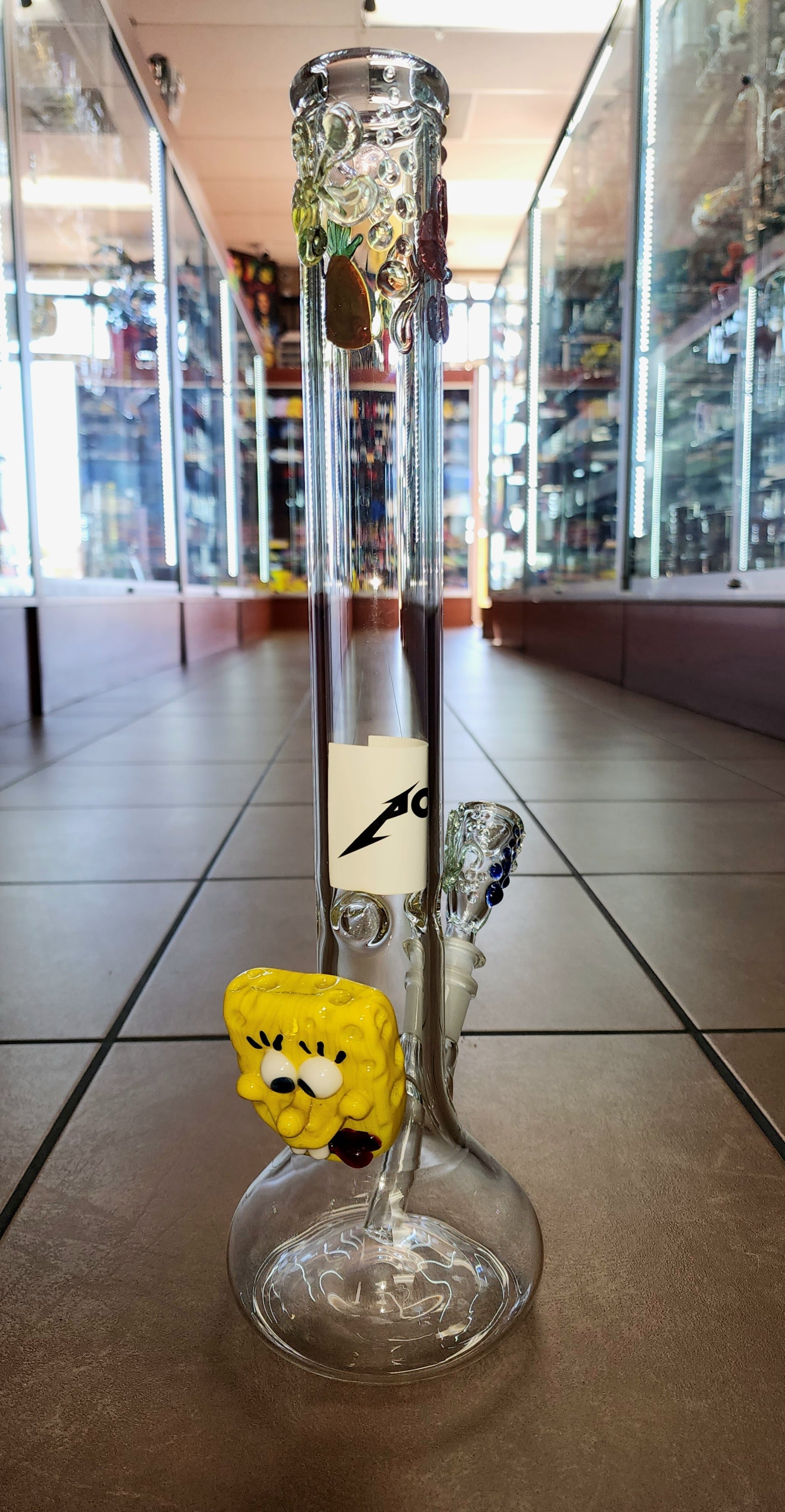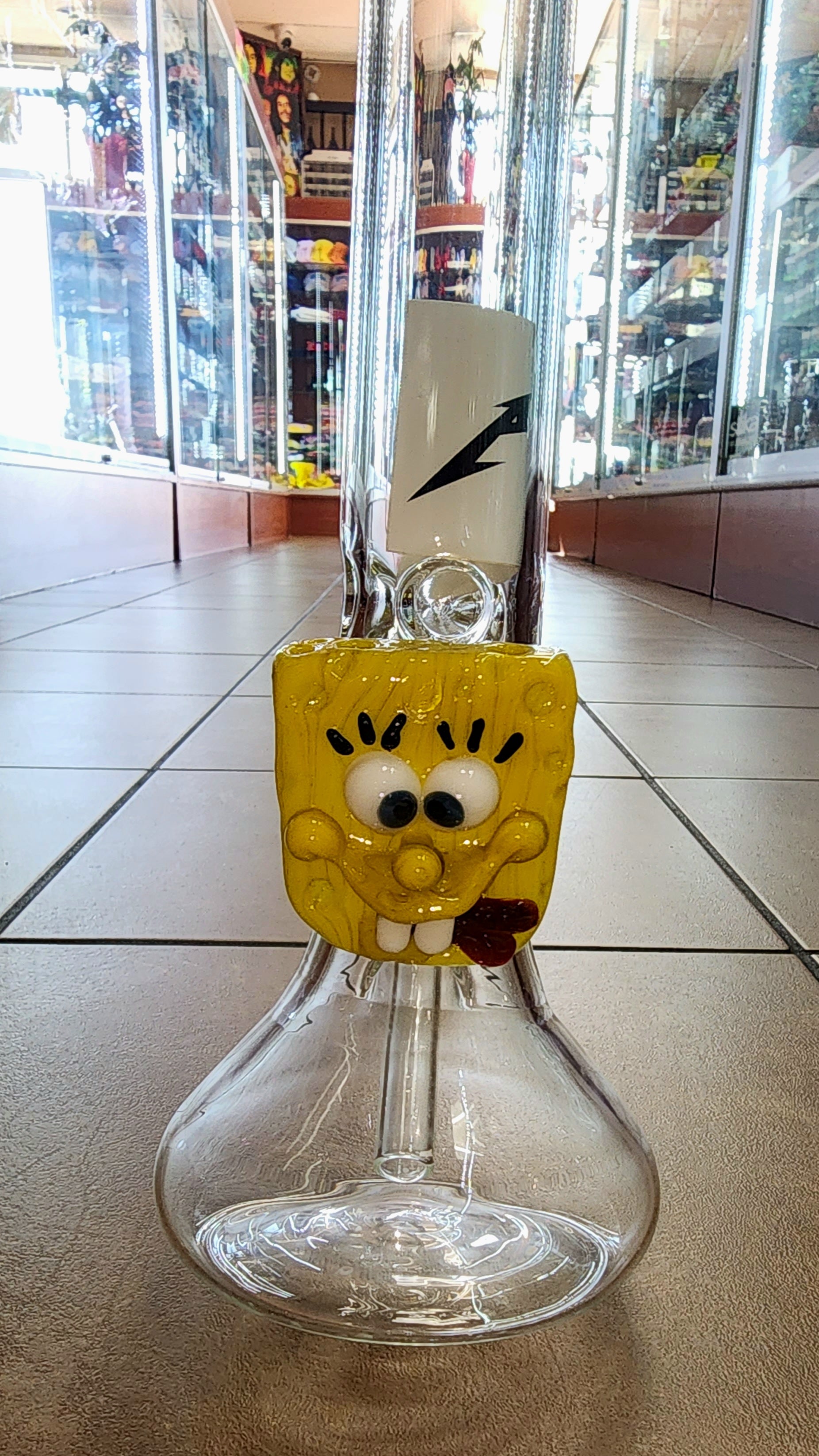 This custom piece Sponge Bob from Dave Popowitz measures right over 16" tall. Features a custom Half Bodied Sponge Bob, custom ocean theme 14mm bowl. Also has ocean theme around the top of beaker.