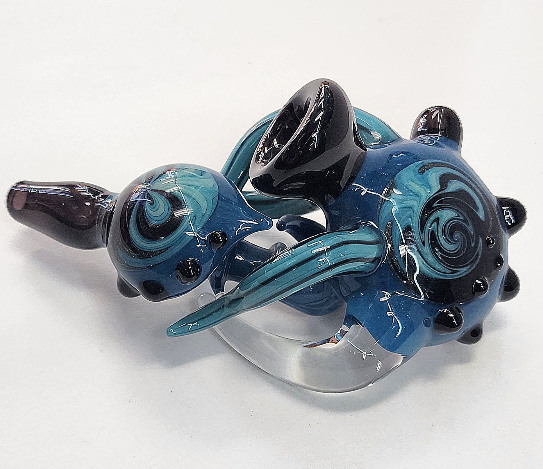 One of a kind hand made by Ian Rasor. This piece was made while he was with Midknight Glass. Been in our collection for awhile. The metallic in the blue makes this piece pop in the sun.