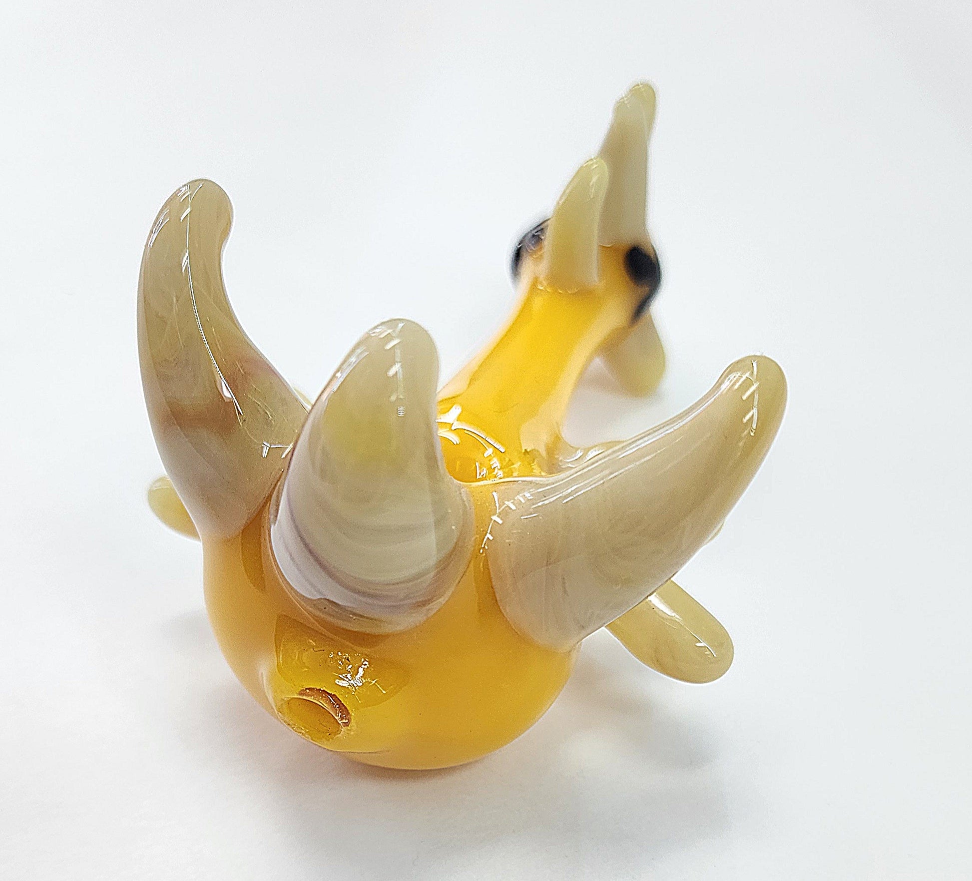 Custom Chicken pipe from Josh Opendaker. This pipe was made back in 2011 and has been in our collecton for awhile now. The yellow color on this pipe is so cool and the ivory color surrounding it makes it super rad. Pipe is about 4.5" in size.