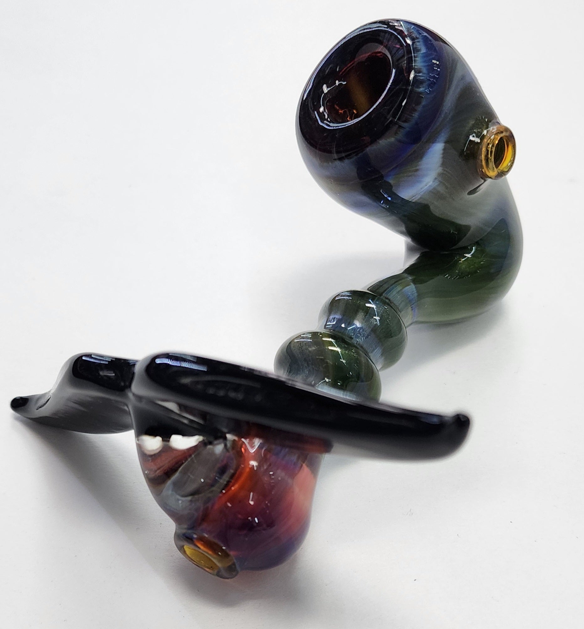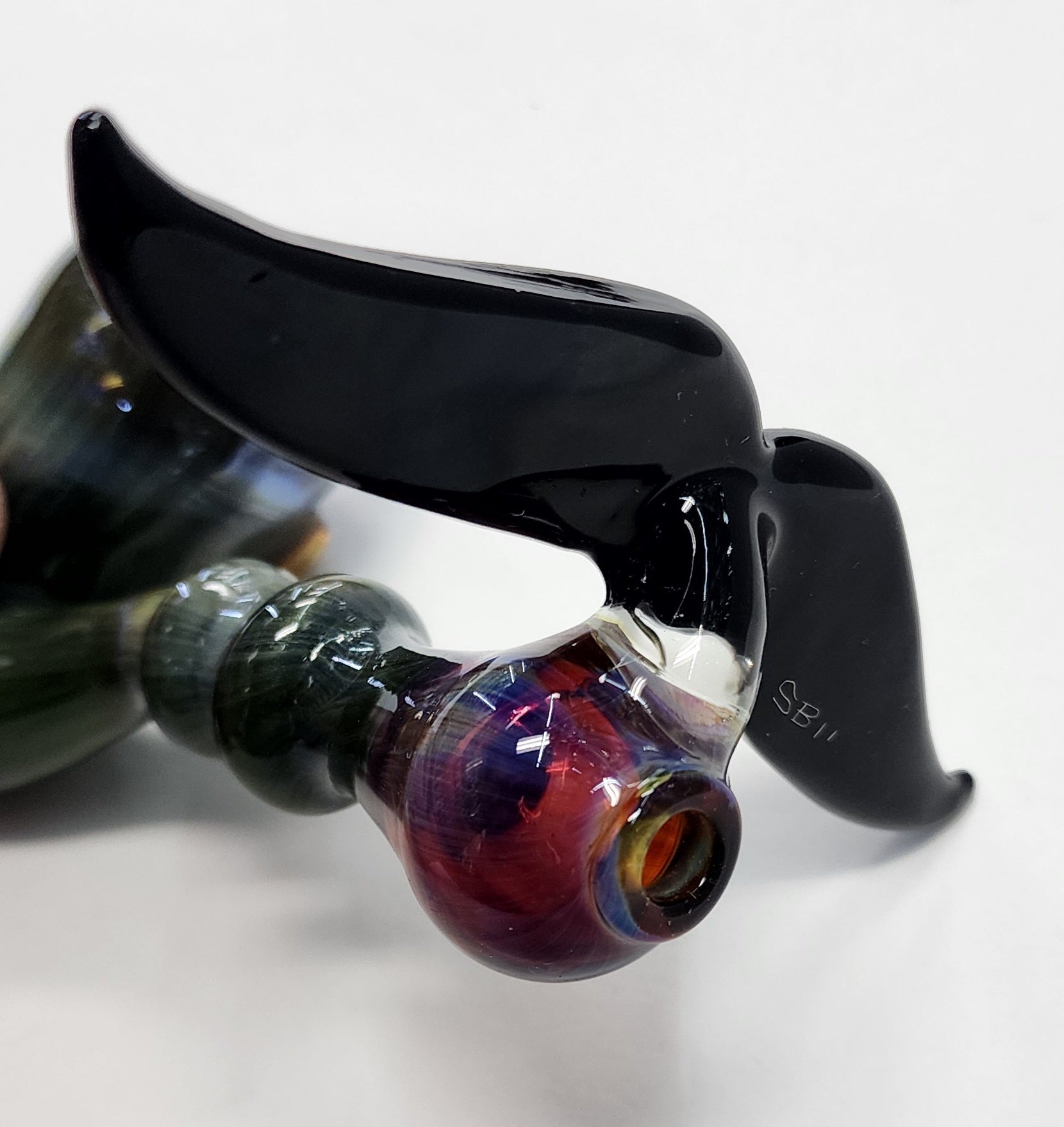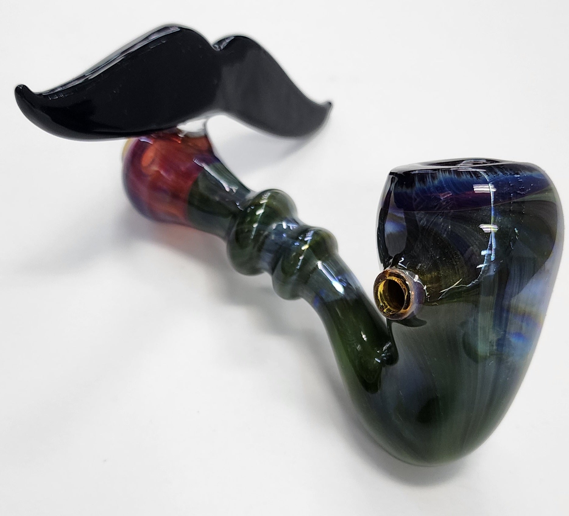 Custom hand made pipe made by the know Saki Bomb! This pipe features a larger mustache, and awesome colors running through the pipe itself. One of a kind piece!