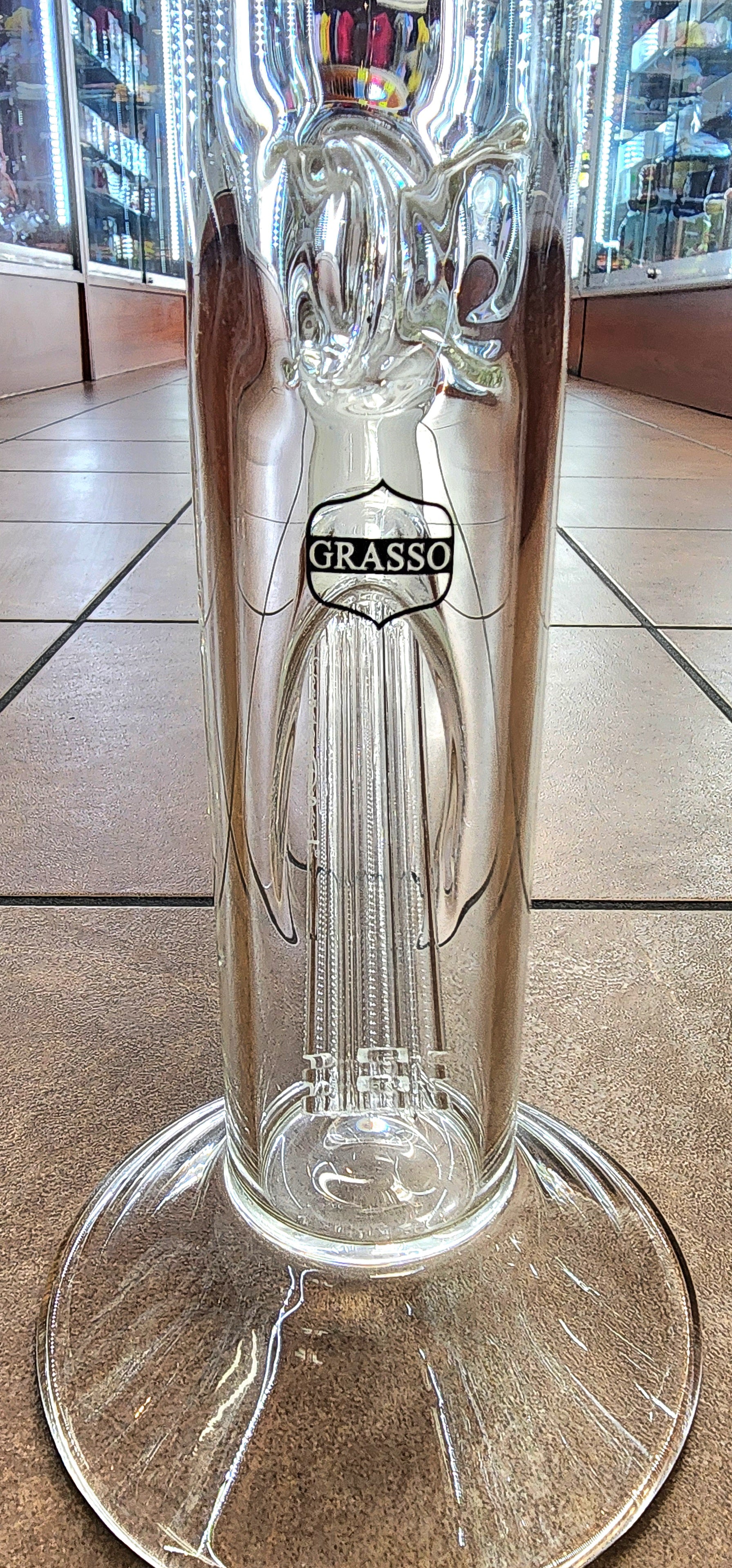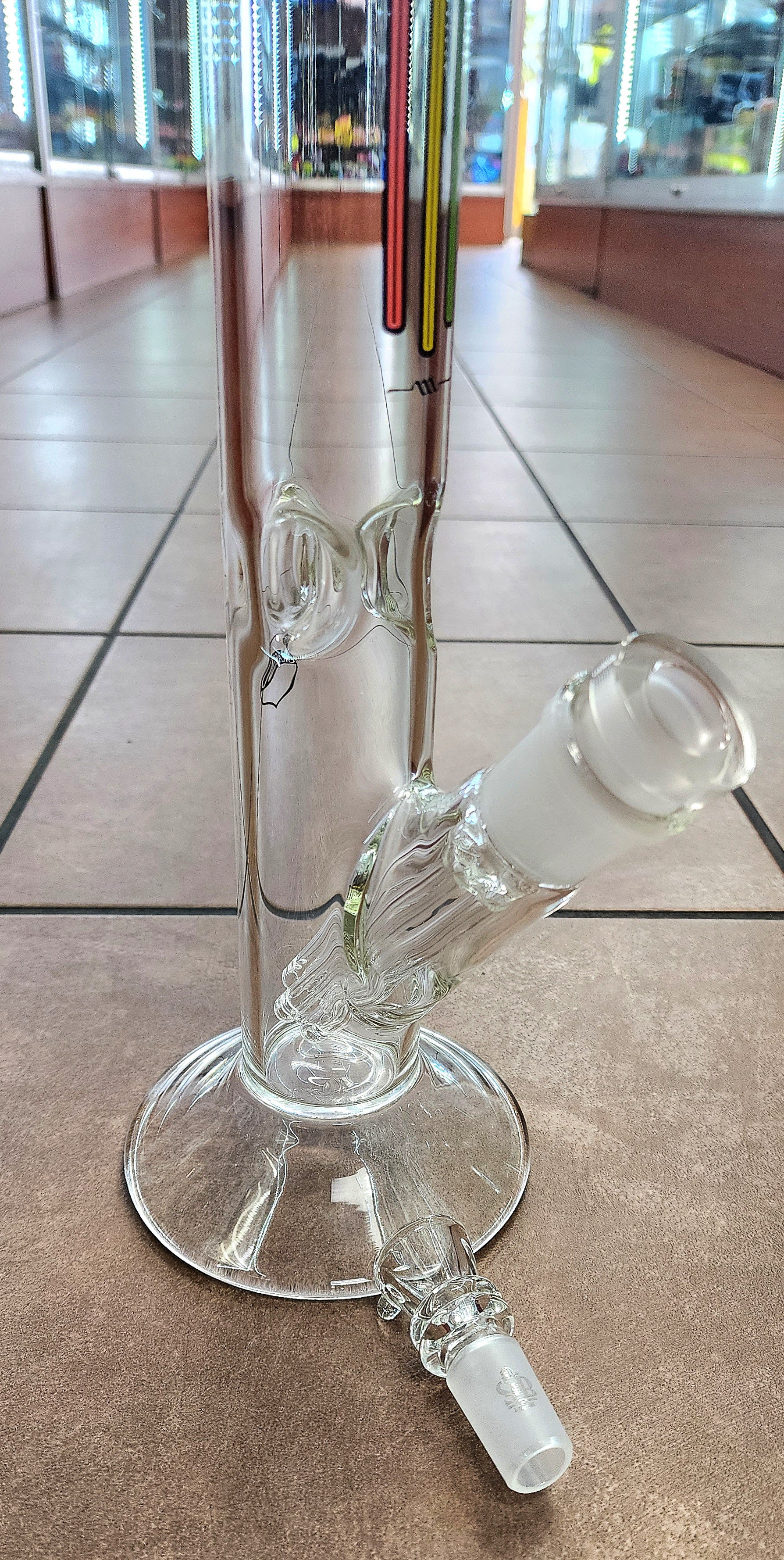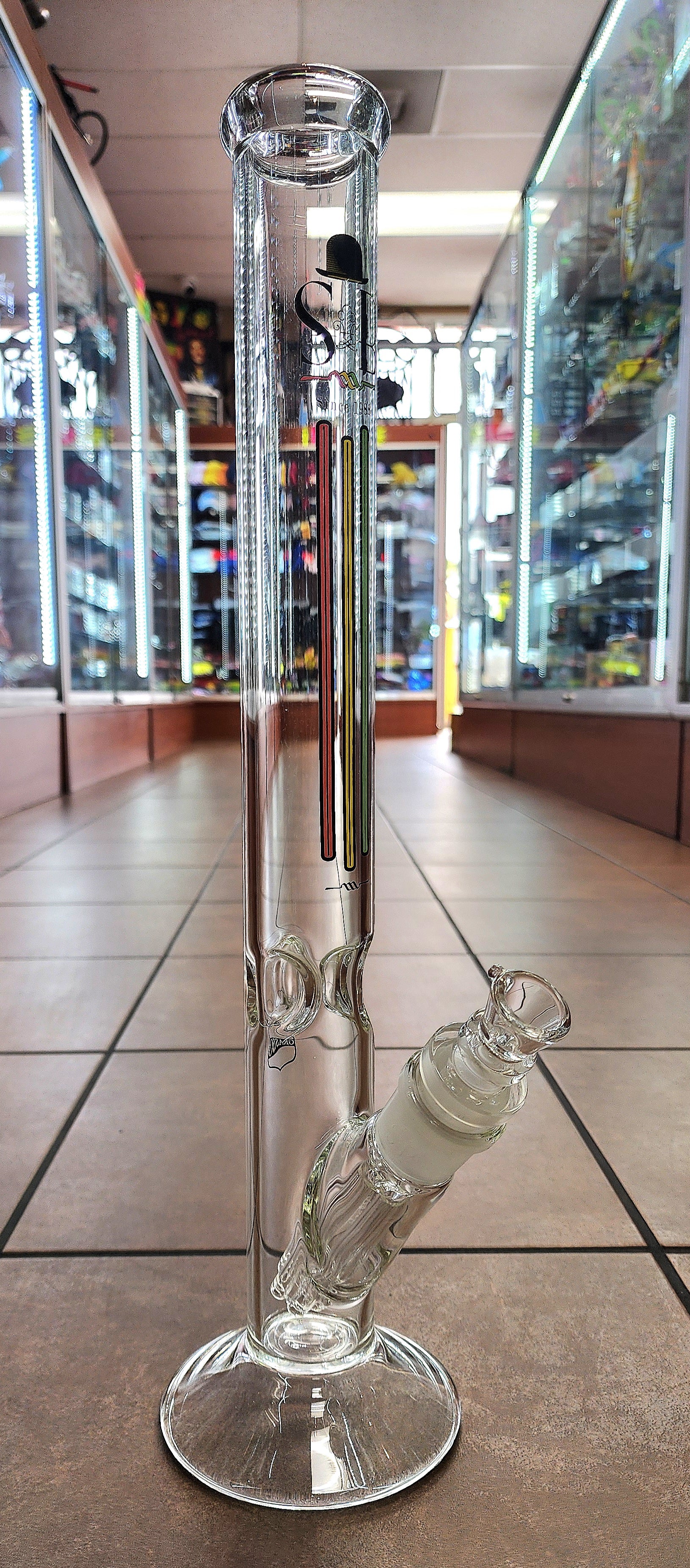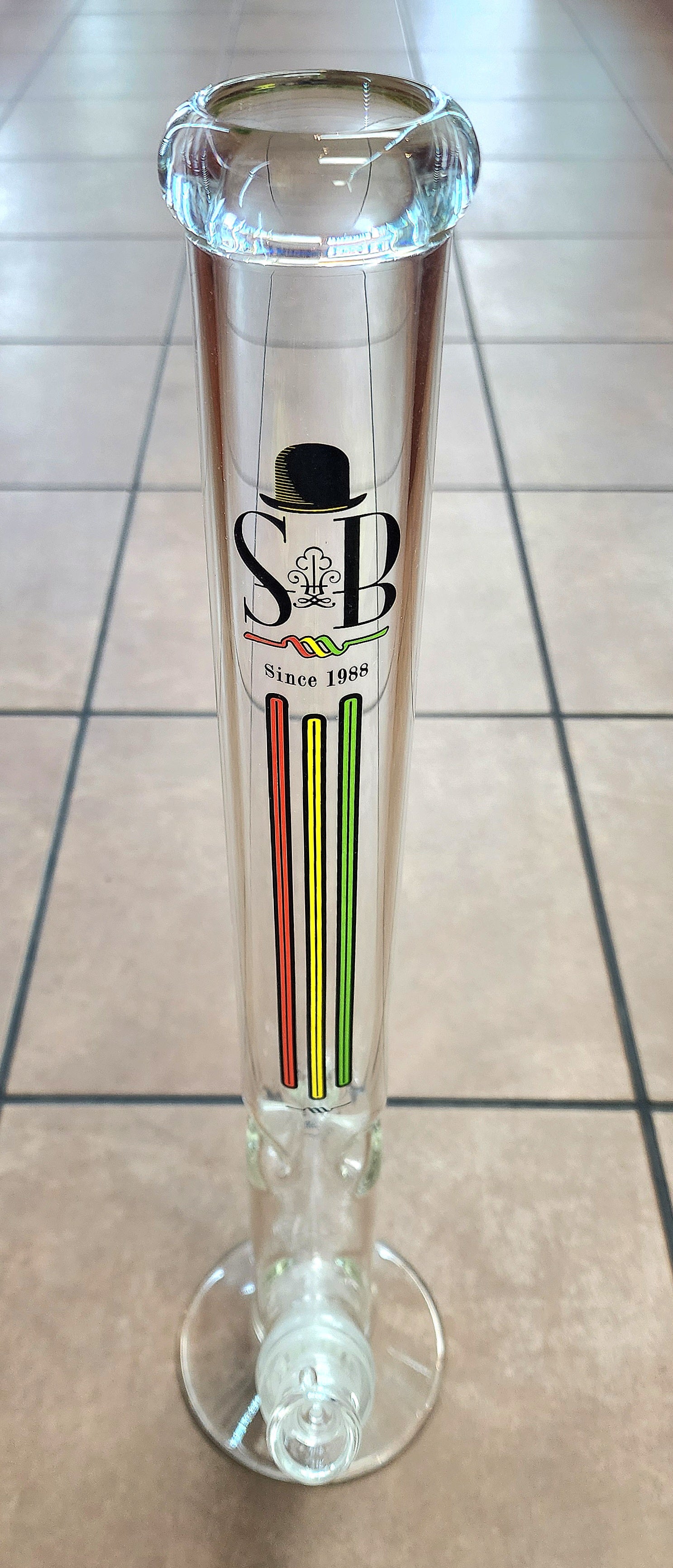 Custom Sheldon Black straight tube style bong with Rasta colors. This has a custom 6-Perc down stem with a 18mm fowl bowl. This piece has a height of 19'' with a 5'' base.